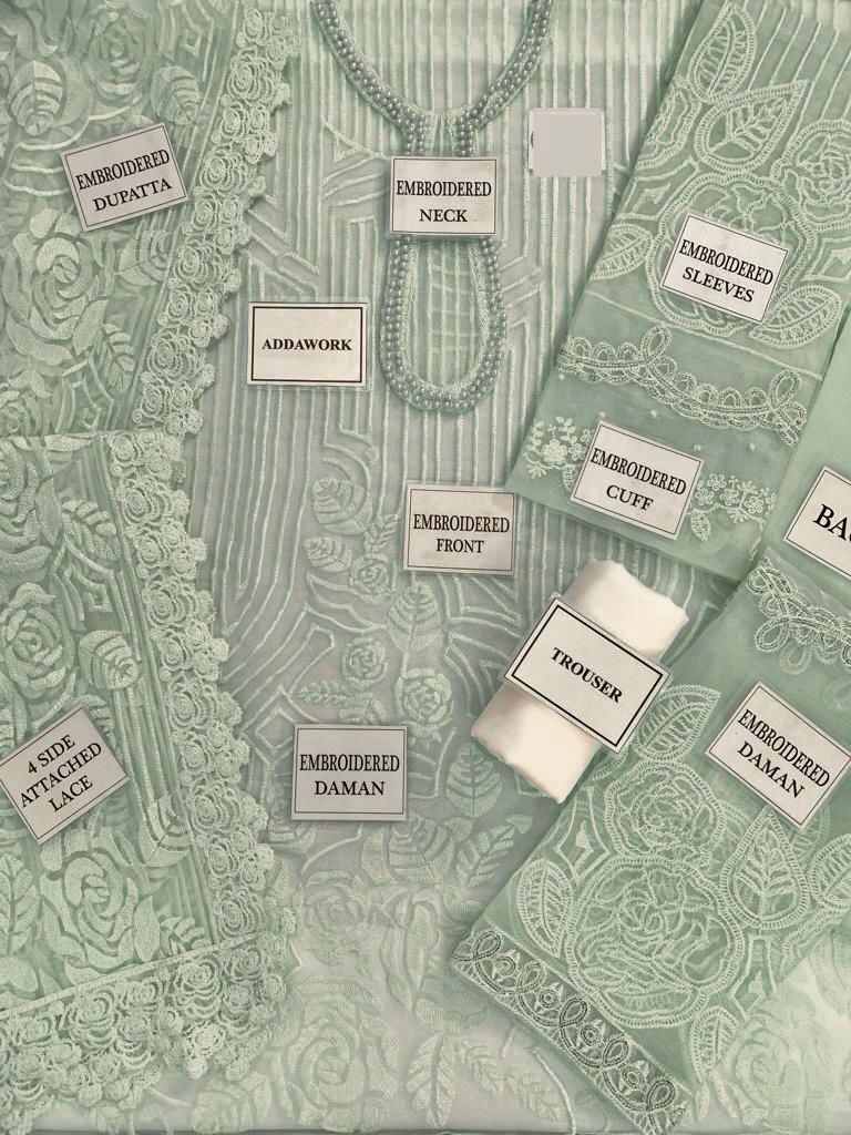 Elegant 3-piece organza dress with full embroidery, pearl neck patch, and heavy ready-to-wear dupatta. Perfect for festive wear.